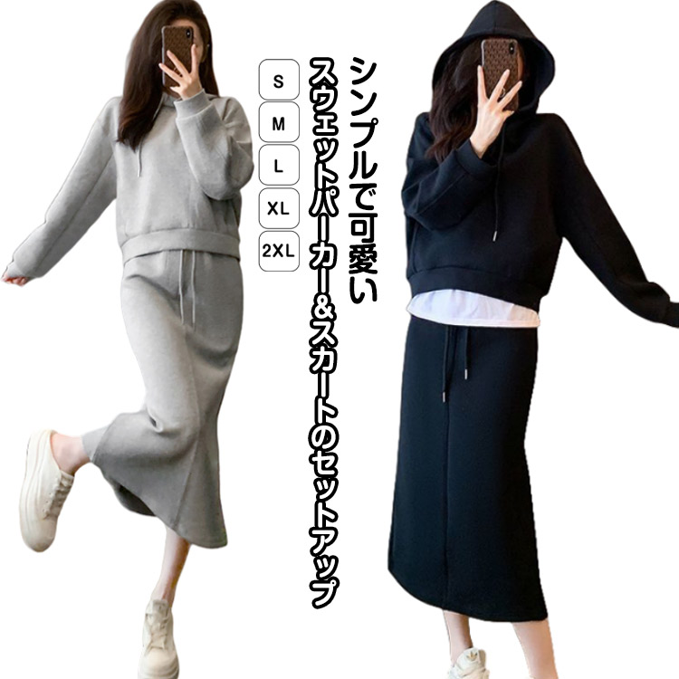 パーカー きれいめ フード付き 春秋 スカート 長袖 スウェットスカート スウェット セットアップ カジュアルセットアップ レディース プルオーバー ロングスカート Aライン フ スウェット上下セット