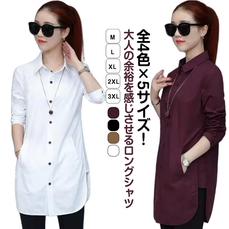 ~3 ロングシャツ 長袖 大人女性 カジュアル 着瘦せ 通勤 春秋 無地