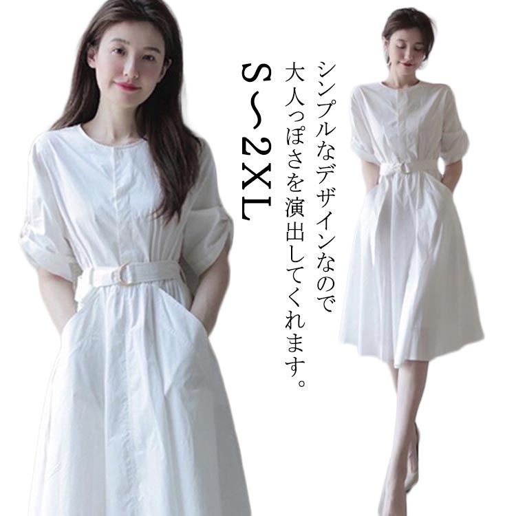 ~2 白ワンピース 膝丈 ライン 体型カバー きれいめ ノーカラー