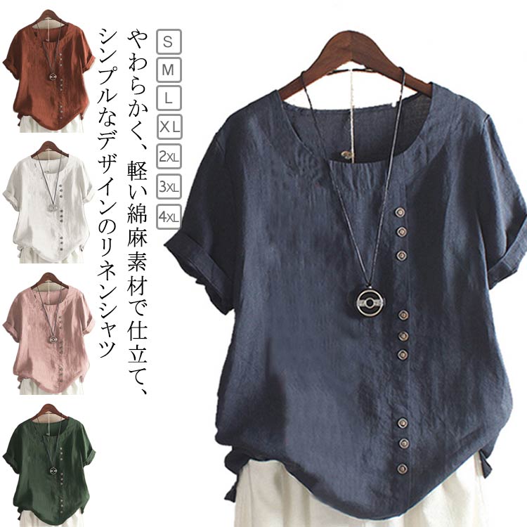 ~4 綿麻ブラウス 薄手 ナチュラル 半袖 ゆったり 体型カバー