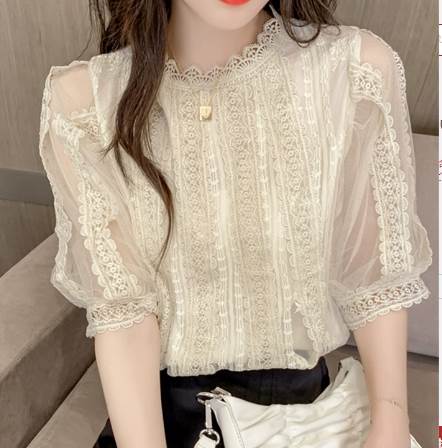 レディース トップス シャツ プルオーバー 半袖 レース袖 ハイネック レース襟 ストレート レース 刺繍 透け感 かわいい 大人可愛い きれいめ シンプル 上品 ガーリー エレガント ラブ おしゃれ