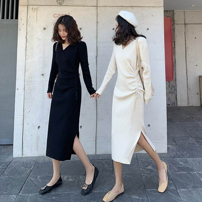 レディース ワンピース ニットワンピ 膝下 ミディアム 長袖 Vネック カシュクール スリット サイドスリット ドロスト ニット リブニット かわいい 大人可愛い カジュアル おしゃれ レト シンプル