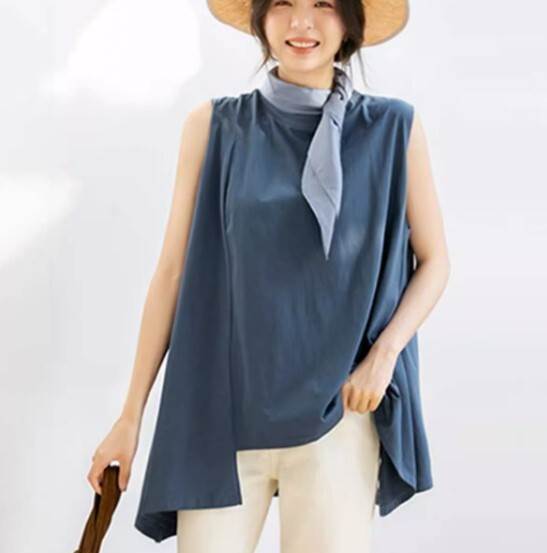 トップス ノースリーブシャツ タンクトップ セーター レディース プルオーバー アシメトリーデザイン ミッドレングス 袖なし 夏 ラウンドネック スタイル レギュラー丈 かわいい