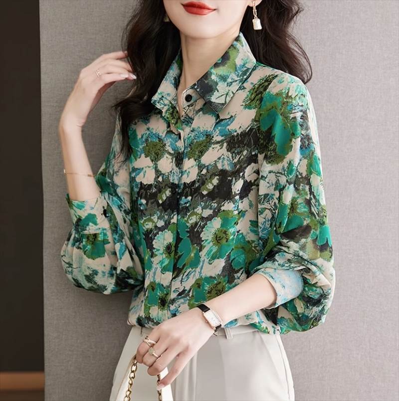 トップス シャツ ミドル丈 長袖 襟付き ストレート シフォン ボタン 前開き かわいい 大人可愛い きれいめ カジュアル 大人 上品 おしゃれ メンズライク 大人女子 柄 花柄 秋 20代 30 春