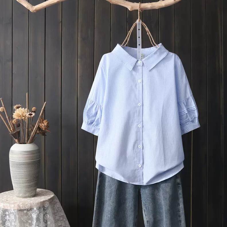 トップス シャツ 半袖 ギンガムチェック パフスリーブ ゆったり 袖あり 襟付き 前開き 綿 麻 リネン 薄手 コットン かわいい シンプル カジュアル 大人 おしゃれ かっこいい レトロ 上品