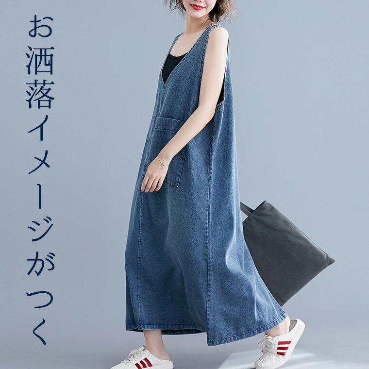 M-2XLサイズ 美シルエットでお洒落なイメージを付ける 縦長視覚でスタイルアップ 40代 50代 デニムノースリーブワンピース ロング丈 マキシ丈 ゆったり エプロンワンピース ロング ワンピースエ