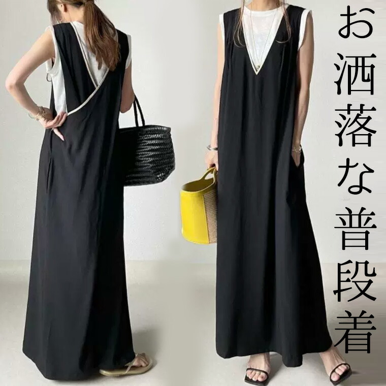 お洒落イメージの普段着 40代 50代 縦長視覚でスタイルアップ カシュクール ノースリーブ ワンピース ロング丈 マキシ丈 ポケット ゆったり フリーサイズ プロン ロング ワンピースエ