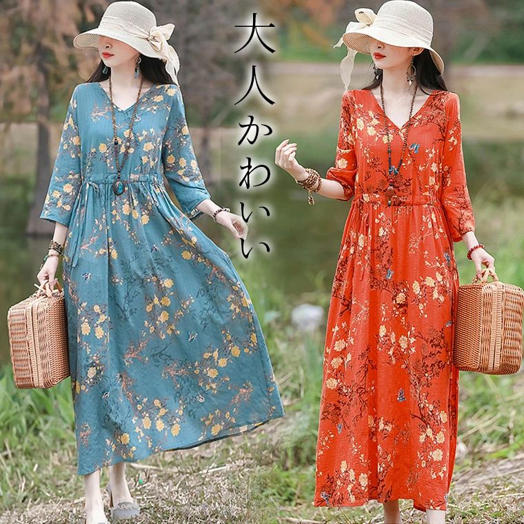 絵画のような絵柄のワンピース 七分袖 花柄 ハイウエスト ゆったり ワンピ ナチュラル カジュアル 麻綿 コットン ロング 丈 マキシ