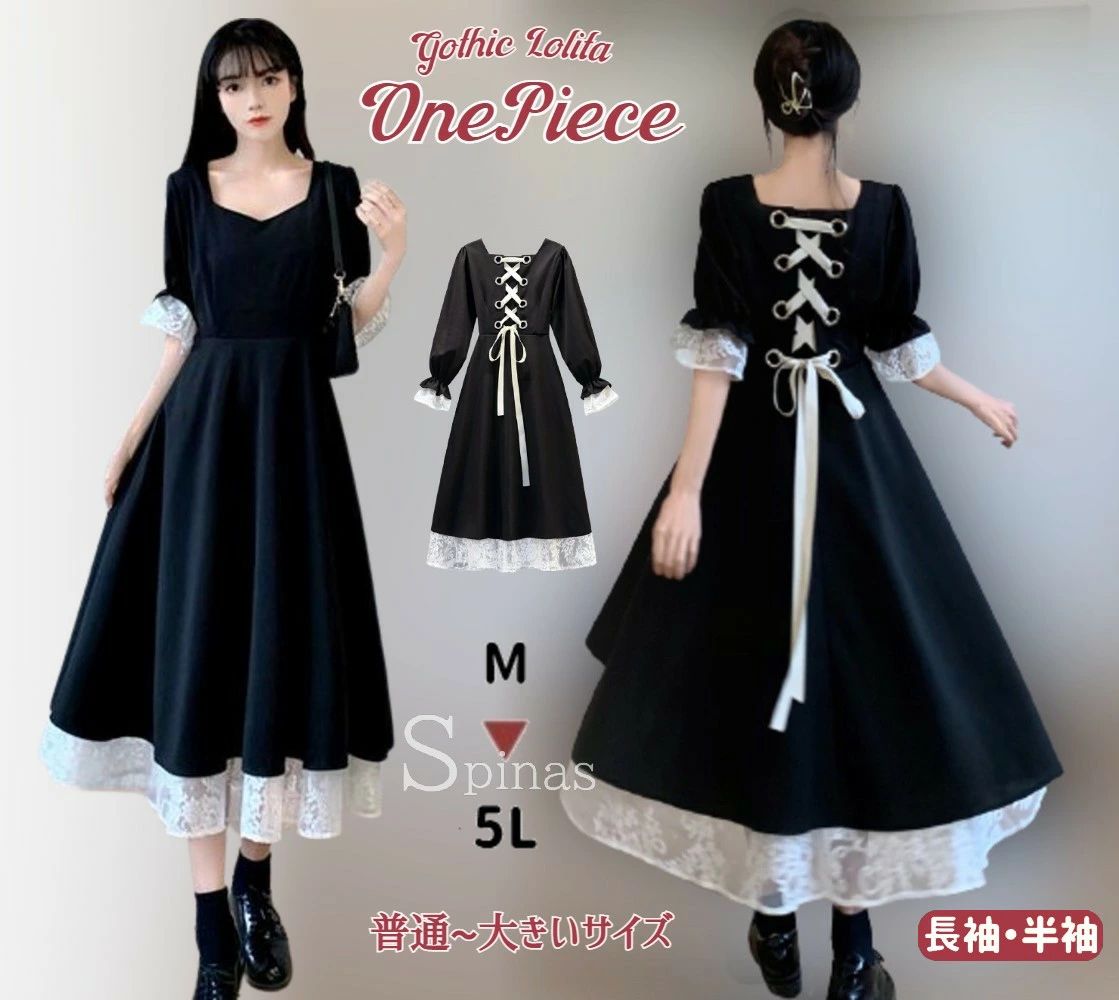 美しいAラインが素敵な ワンピース ゴスロリ 編み上げリボン お嬢様 ロリータ 可愛い レース リボンレース コスプレ パーティー お出かけ 大きいサイズ M L 2L 3L 4L 5L 全2色