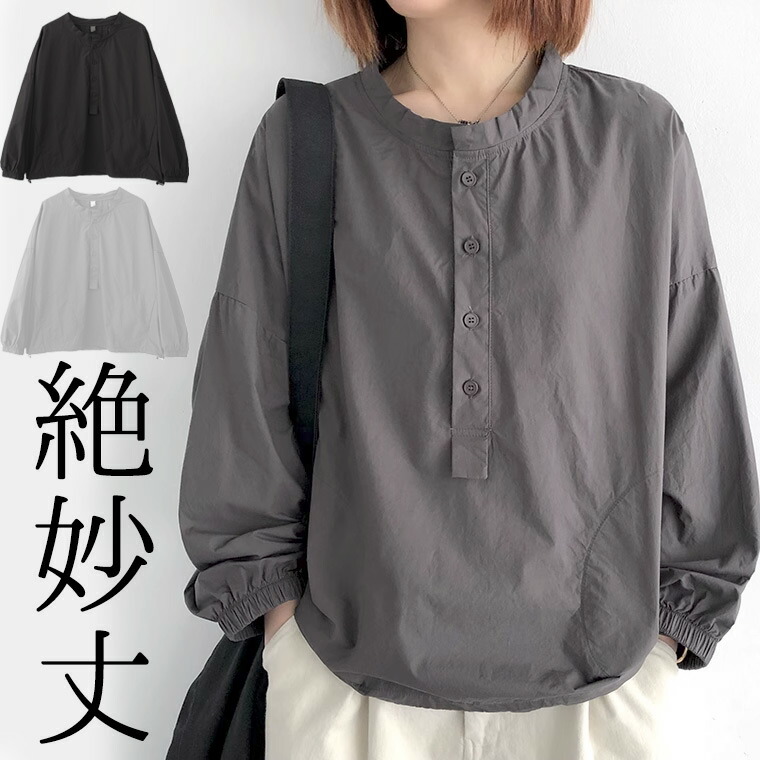 カーディガンともよく合う 40代 50代 かぶって着るかわいいシルエット ハーフタイプ 長袖ブラウス 長袖シャツ 長袖カットソー ノーカラー 襟無し 襟なし ラウンドネック スモッグ