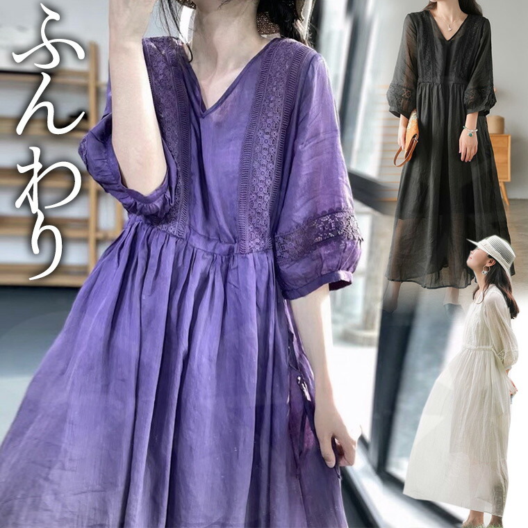 ゆったり涼しい Vネックで小顔見せ アジアン ワンピース リゾート 南国 アジア リゾートワンピ 綿 大きいサイズ