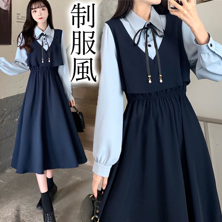 S-2XL 清楚イメージ 制服風ハイウエストワンピース フェイクツーピース 重ね着に見える レイヤード セット 一式 リボン 胸リボン ベスト アイドル お嬢様 ロリータ 可愛い レース リボンレース
