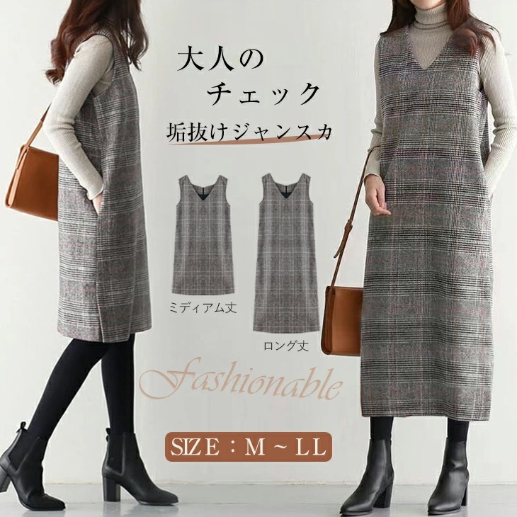 ジャンパースカート 選べる長さ ロング丈 ミディアム丈 ノースリブ vネック チェック柄 カジュアル フォーマル オフェス 通学 通勤 秋 冬