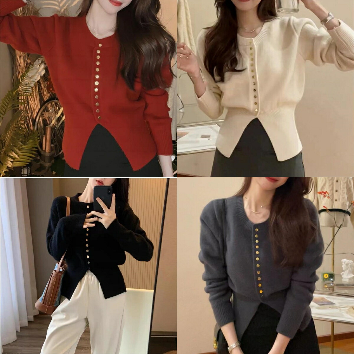 カーディガン 赤 ニット レディース スリット カーデ トップス 冬 秋 春 秋冬 Uネック ラウンドネック 着痩せ 金ボタン ボタン きれいめ トレンド お洒落 カジュアル 黒 ダークエンジェ