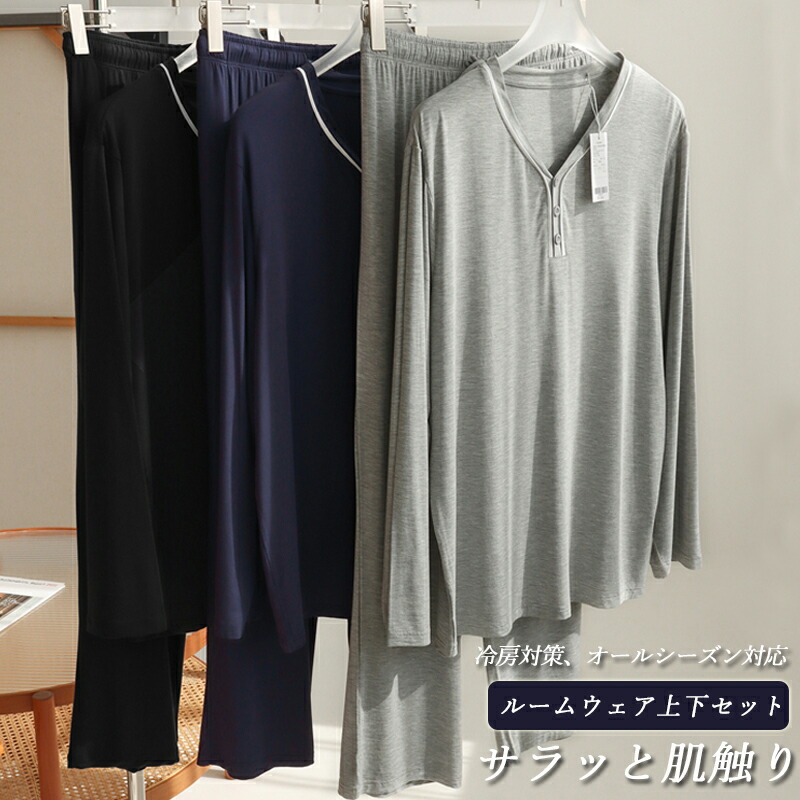 【送料無料】パジャマ 長ズボン 部屋着 ゆったり 吸湿性 セットアップ 夏服 寝巻 入院着 ナイトウェア 旅行 着替え 大人用 グレー ネイビー ブラック