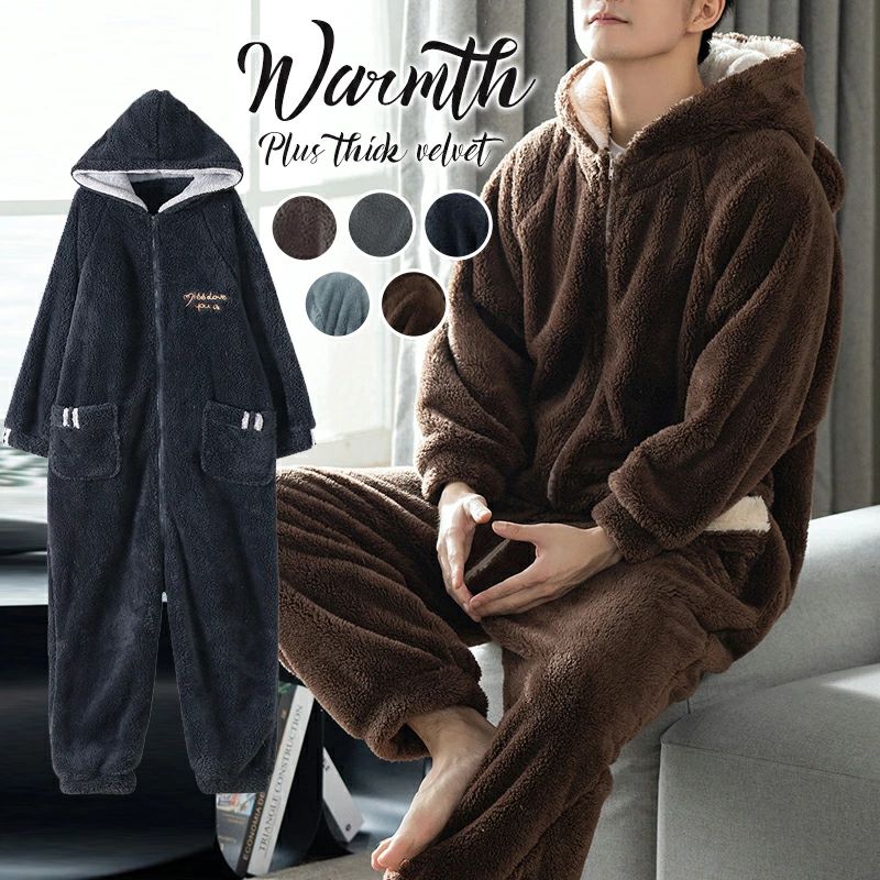 オールインワン パジャマ メンズ ルームウェア フード付き 大人 厚手 冬 ふわふわ 大きいサイズ ナイトウェア ファスナー 前開き 長袖 部屋着 ロング丈 寝間着 お風呂上り
