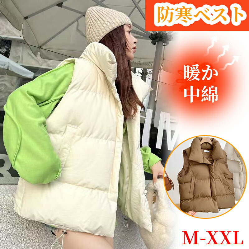 【送料無料】あったか 冬ベスト ストリート ゆったり 中綿入り 防寒対策 ベストジャケット ダウン風 ハイネック 通勤 普段着 ブラック ホワイト カーキ 2