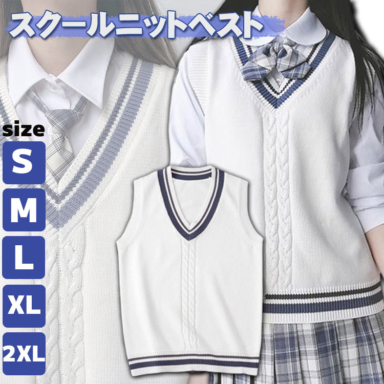ニットベスト Vネック スクールベスト ニットセーター ケーブル編み 女の子 男の子 ホワイト 男女兼用 スクールセーター 制服 プルオーバー ライン入りノースリーブ 学生服 トップス アウター コス