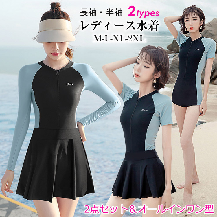 水着 レディース 半袖 長袖 2タイプ ワンピース オールインワン スカート付き 2点セット 体型カバー ママ水着 着痩せ セクシー 大きいサイズ M L XL 2XL