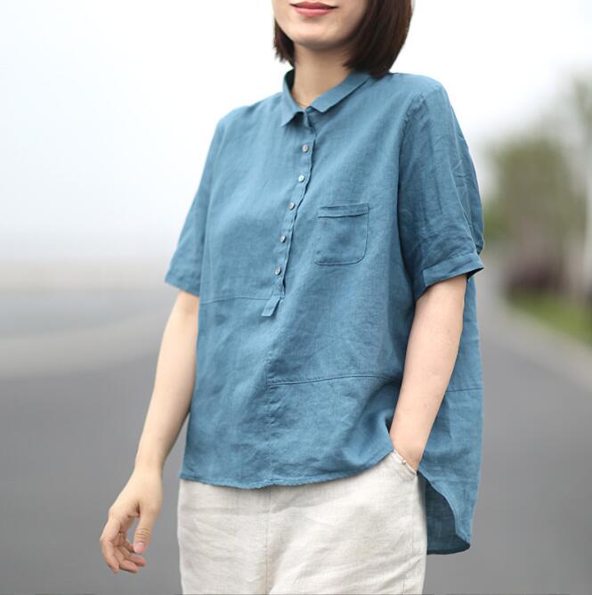 ブラウス レディース 夏 半袖 リネンブラウス トップス 無地 前開き 綿麻 折り襟 無地 シンプル 前後差 Tシャツ カジュアル 体型カバー