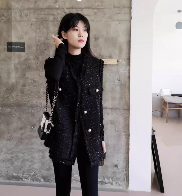 ツイード ノーカラー ベスト ジャケット ジレレディース アウター ジレ 羽織り レイヤード 体型カバー フリンジ ポケット