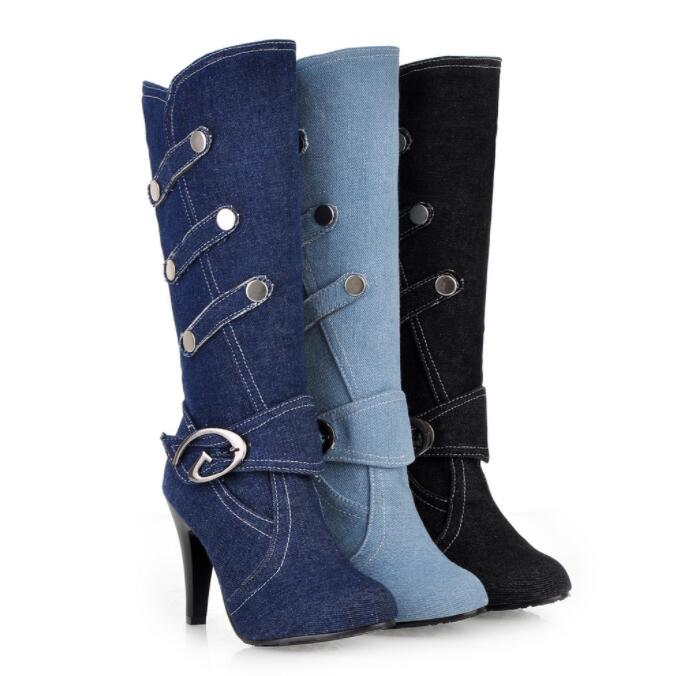 ジョッキーブーツデニムブーツロングブーツ 秋冬レディース デニム ポインテッドトゥ 太ヒール 8センチハイヒール チャンキーヒール