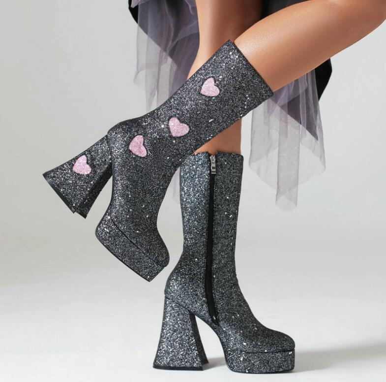 レディースブーツロングブーツ厚底ブーツ キラキラ ブーツ 歩きやすい ロングブーツ ブーツ 靴 美脚 太ヒール 疲れにくい