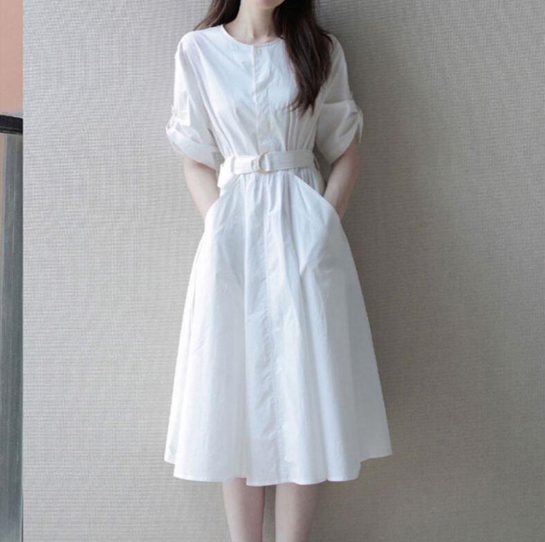 シャツワンピース白ワンピース オフィスカジュアル 上品 きれいめ 通勤 レディース ミセス 大きいサイズ 春夏秋 半袖 フレアスカート