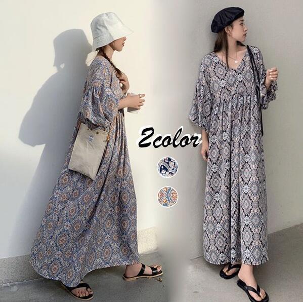 ワンピース 半袖 ロングワンピース エスニック パフスリーブ vネック 選べる2丈 リゾートワンピース海フレア フレアワンピース