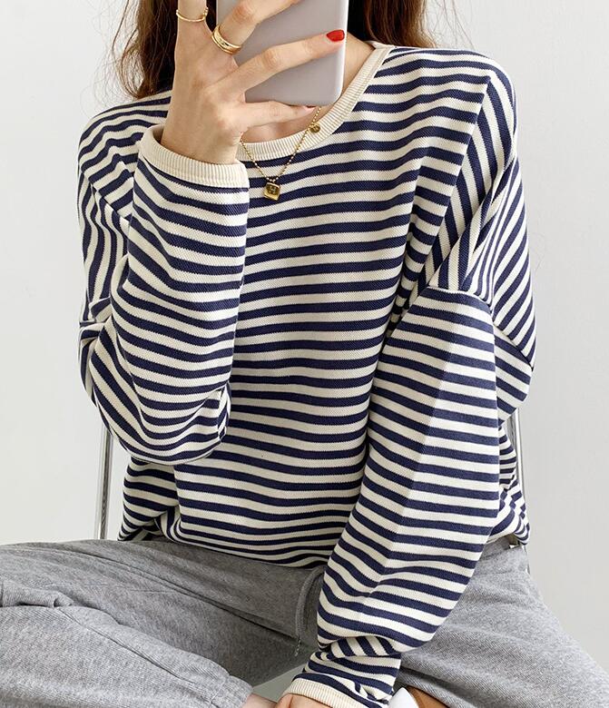 ボーダー柄シャツ ロング丈 カットソー プルオーバー シャツ パーカートップス長袖 クルーネック シンプル 重ね着 きれいめ