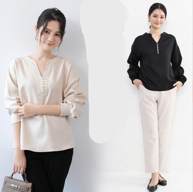 トップス レディース カットソー Vネックパール付き カジュアル 長袖 おしゃれ 可愛い無地 ゆったり 体型カバー ブラック ベージュ