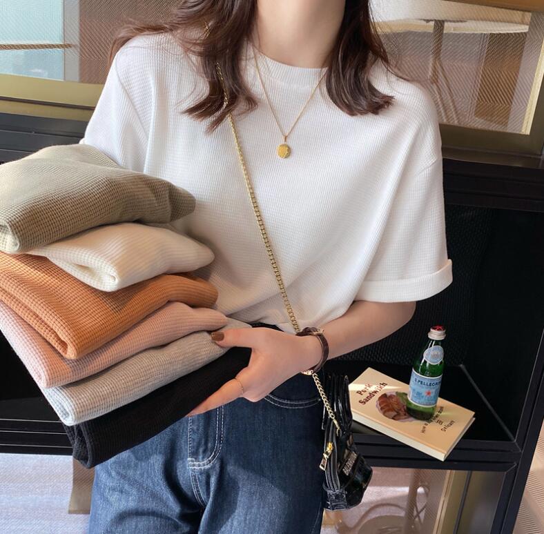 ワッフル素材 半袖 カットソー トップス シャツ クルーネック ラウンドネック ロールアップ レディース ゆったり コットン 綿 春 夏