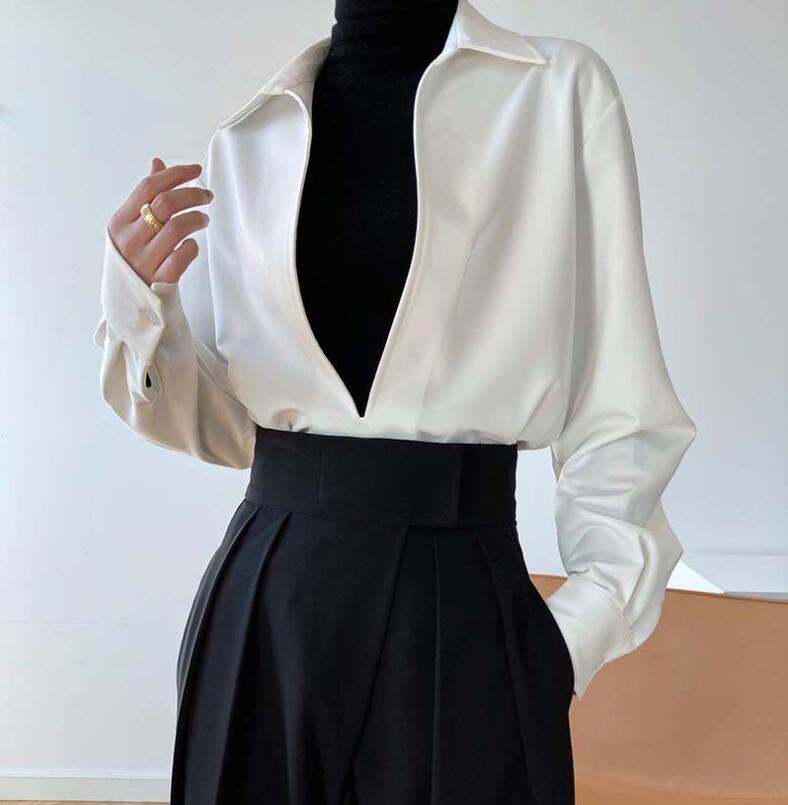 シャツ 深い Vネック レディース トップスブラウスシャツ 長袖 きれいめ シンプル カジュアル 無地 スキッパーシャツ トップス