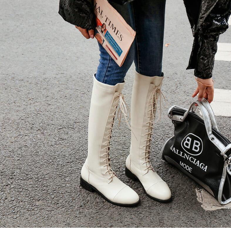 ロングブーツ レースアップブーツ 美脚 編み上げ ブーツ ゴスロリ コスプレ 太ヒール 黒 ブラック 靴 レディース 合皮 女性 カジュアル