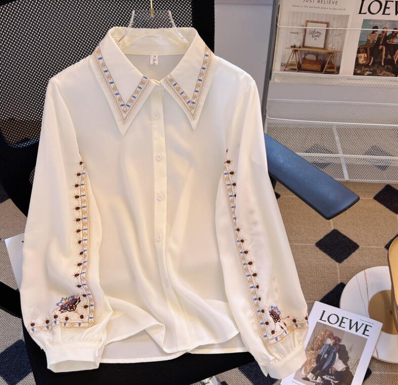 シャツ ブラウス レディース 白シャツ 刺繍 シャツ 花柄刺繍シャツ 花柄刺繍ブラウス レディース 長袖 トップス 新作 前開き 体型カバー
