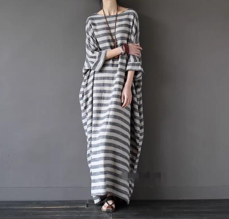 リネンワンピース レディース 五分袖 ネック ワンピ ロング丈 ワンピース ボーター柄 綿麻 パフスリーブ ゆったり 大きいサイズ 着痩せ