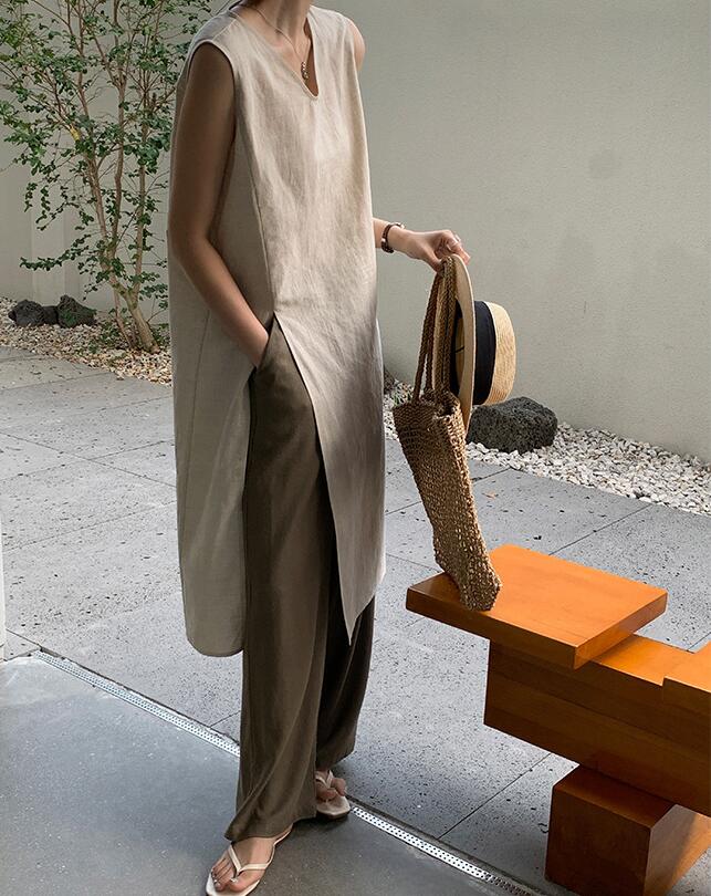 リネンワンピース リネン ワンピース レディース スリット入り リネン風 可愛い きれいめ ゆったり ノースリーブ 体型カバー 大きいサイズ