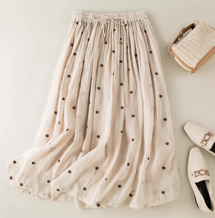 ロングスカートフレアリネン綿麻森ガールウエストゴムドット柄水玉ミモレ丈 ハイウエスト レディース ライン