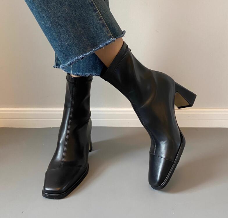 ショートブーツ ソックスブーツ ブーツ レディース 秋冬 ブーツ ヒール5.5cm 靴下ブーツ チャンキーヒール 美脚 疲れない 安定感 歩きやすい スクエアトゥ