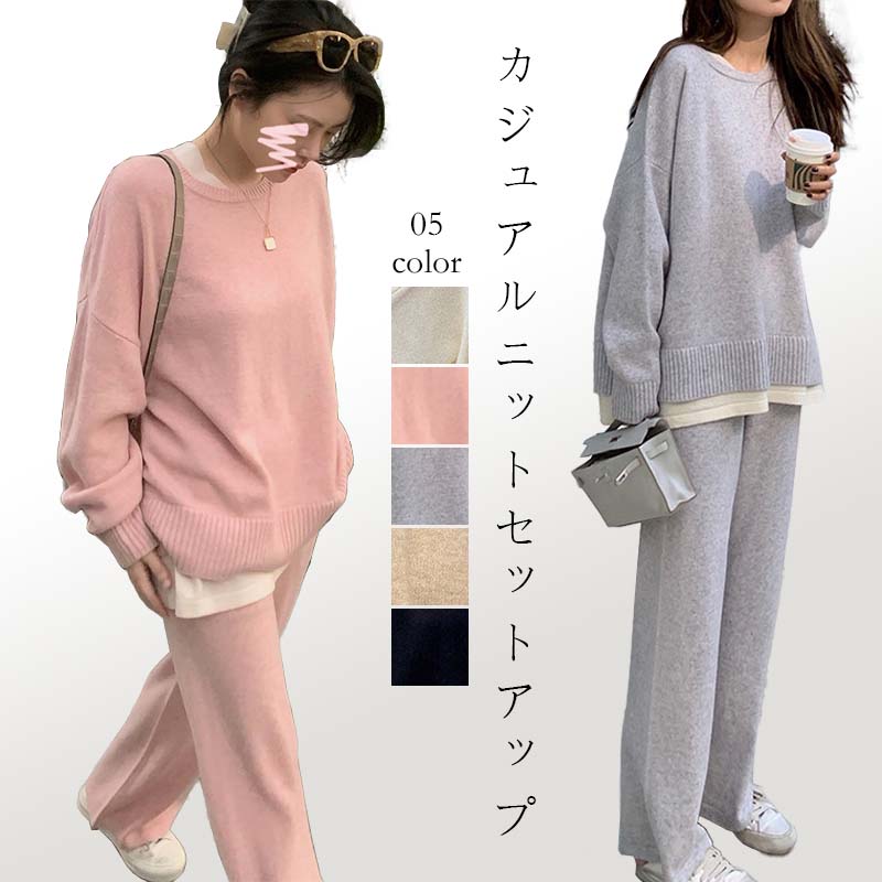 ニット セットアップ パンツ レディース ニットセットアップ レイヤード ワイドパンツ ニットパンツ