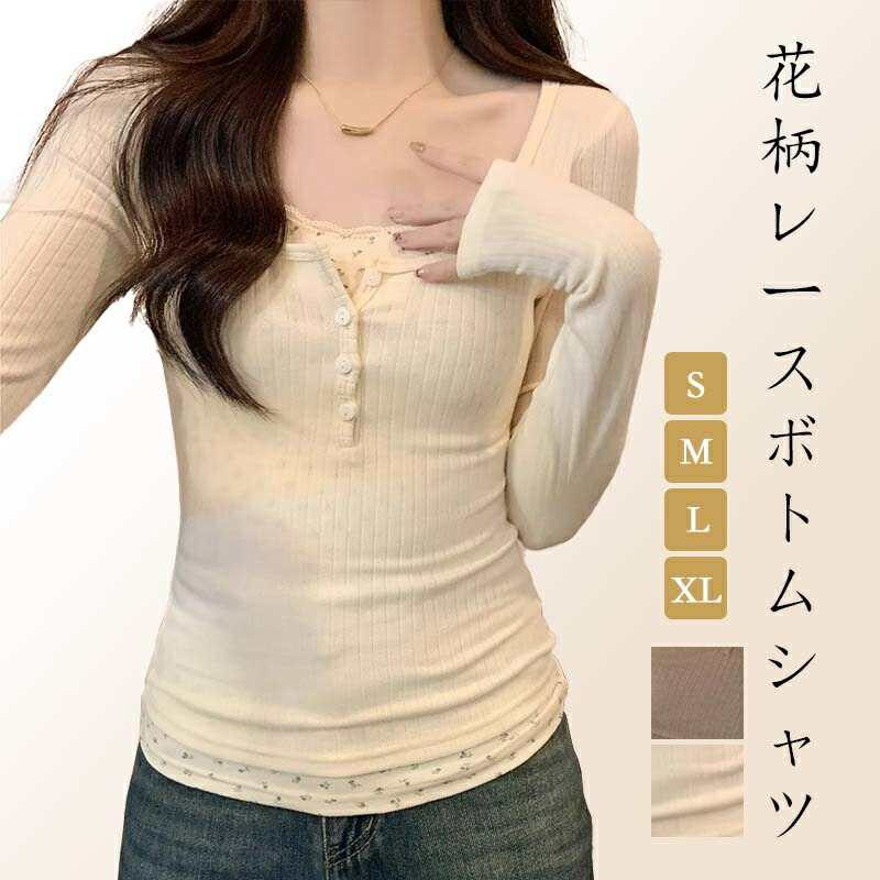 トップス 上着 レース 偽2件 ネック 長袖 カットソー 長袖 レディース きれいめ 重ね着 あったか