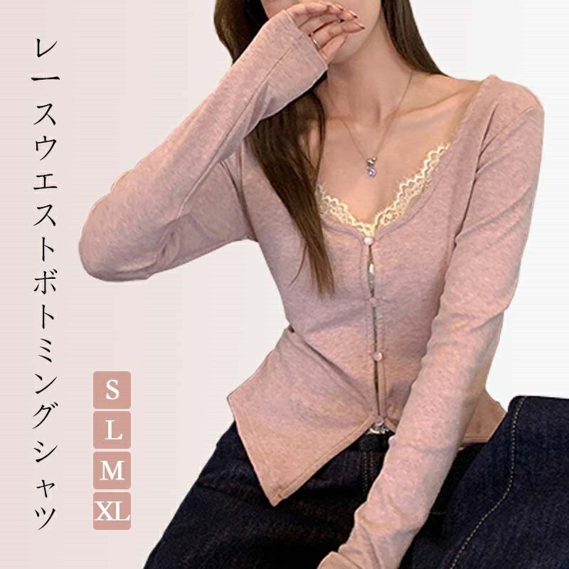 トップス 上着 レース 偽2件 Vネック 長袖 カットソー 長袖 レディース きれいめ 重ね着 あったか