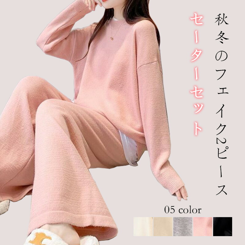 2点セット 重ね着 セーター ワイドパンツ ワンマイルウェア セットアップ レディース フェイクレイヤード