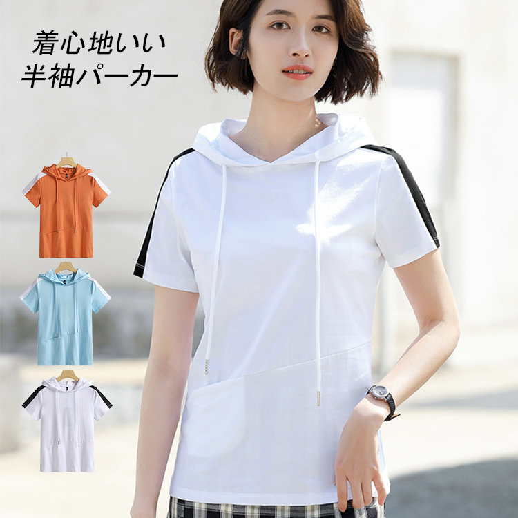 半袖パーカー レディース 半袖 トップス 薄手 大きいサイズ パーカー Tシャツ カットソー 綿 おしゃれ カジュアル