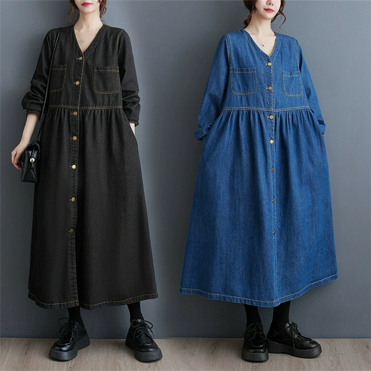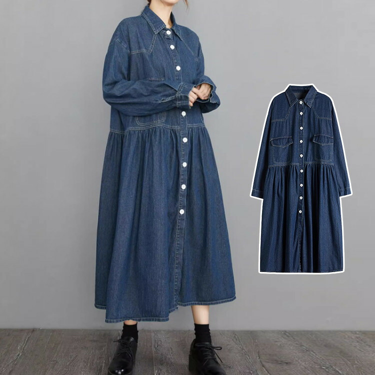 ワンピース レディース デニム 長袖 ロング丈 ロングワンピース デニムワンピース ゆったり ボダン付き ゆるワンピース