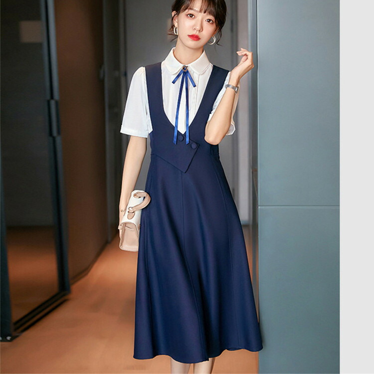 偽2枚 ワンピース 半袖 ロングワンピース 膝丈 仕事 通勤 オフィス おしゃれ きれいめ ワンピ 女子 女性 オトナ 春 夏