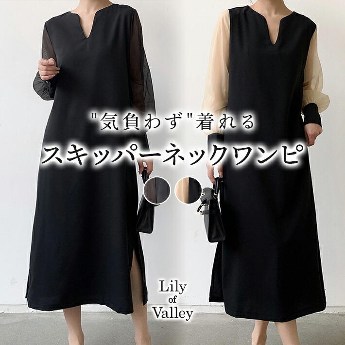 上品な雰囲気でも気負わず着れる スキッパーネック サイドスリット ワンピース レディース ふんわり 大きいサイズ シアー ミモレ ロング オフィスカジュアル 膝下 ボリュームスリーブ