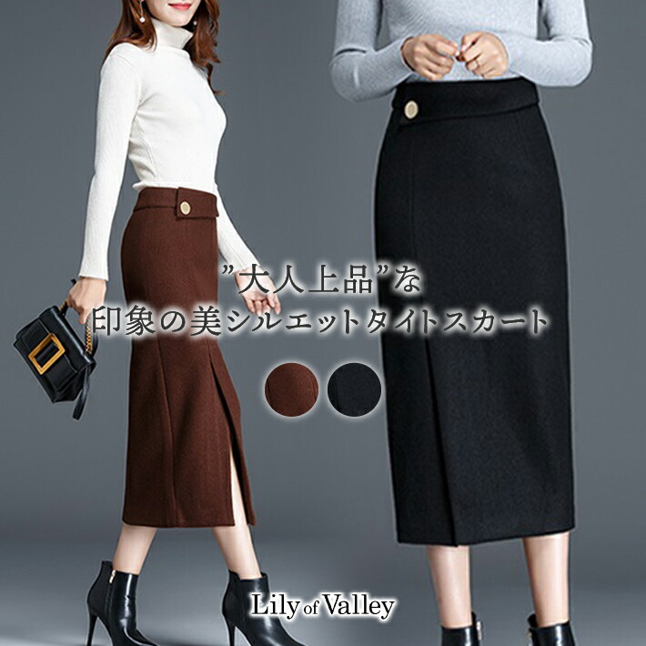 な印象を与えてくれる きれいなシルエット デザインの タイトスカート スリット ボトムス ミモレ ハイウエスト ボタン 黒 ブラック ブラウン キャメル
