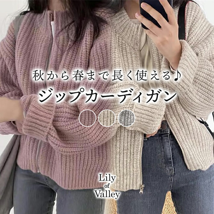 秋口から春先まで長く使える ざっくり ニット ジップ カーディガン レディース 清楚 ボリュームスリーブ クルーネック セーター きれいめ オフィスカジュアル オフィス バルーンスリーブ