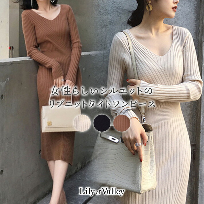 大胆に開いたVネックが女性らしい☆編地切替ストレッチリブニットタイトワンピースが登場 レディース セーター ロング丈 膝下 ひざ下 ミモレ丈 清楚 秋 冬 春 タイト 長袖 Vネック